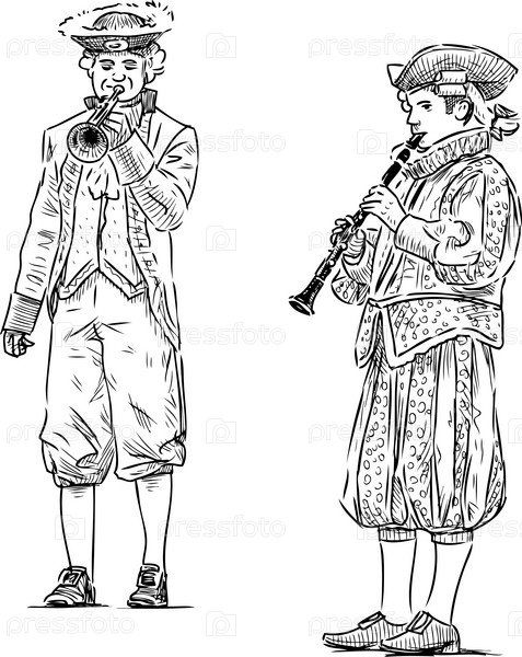 Эскиз музыкантов в карнавальных костюмах, играющих на трубе и гобое