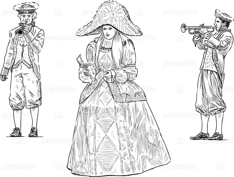 Эскиз женщины в карнавальном костюме и музыкантов в винтажных костюмах, играющих на трубах