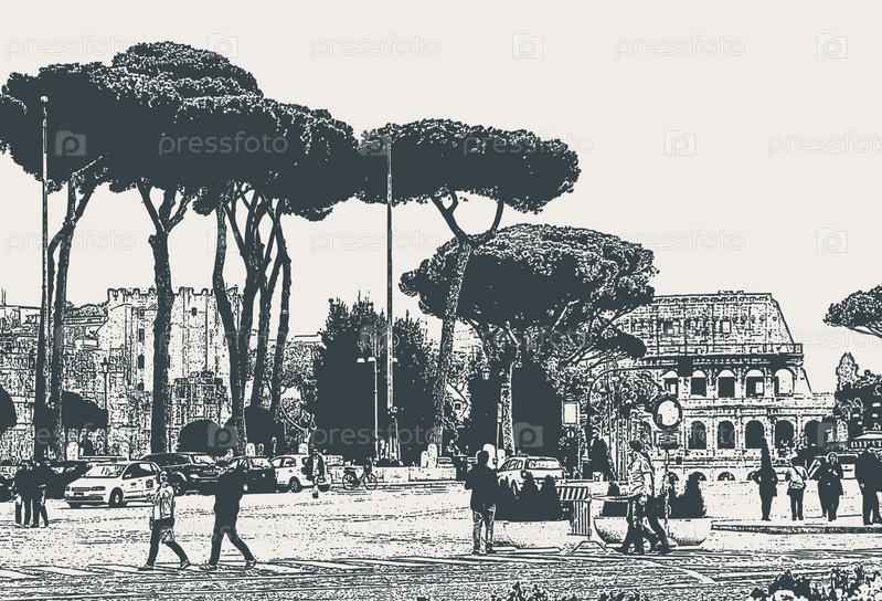Векторный городской пейзаж улицы Рима с соснами и руинами Колизея