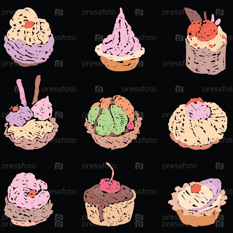 Векторное изображение набора различных нарисованных вкусных пирожных