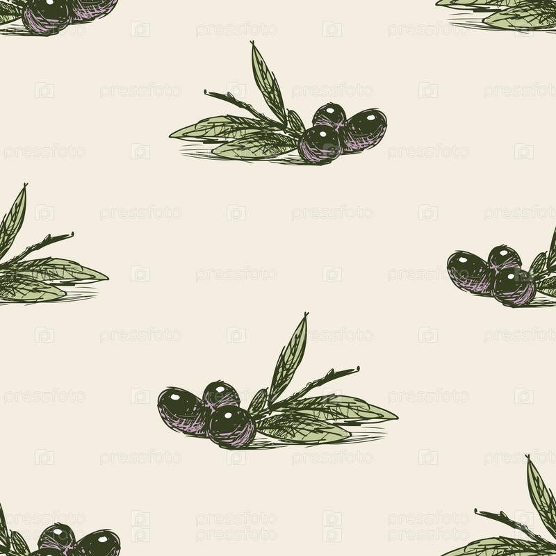 Бесшовный рисунок нарисованной оливковой ветви со спелыми оливками