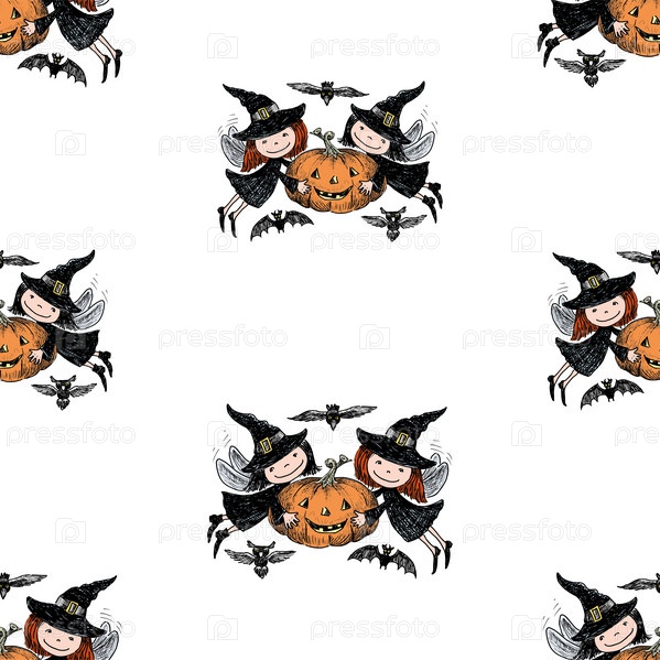 Бесшовный рисунок веселых летающих эльфов с тыквой на Хэллоуине