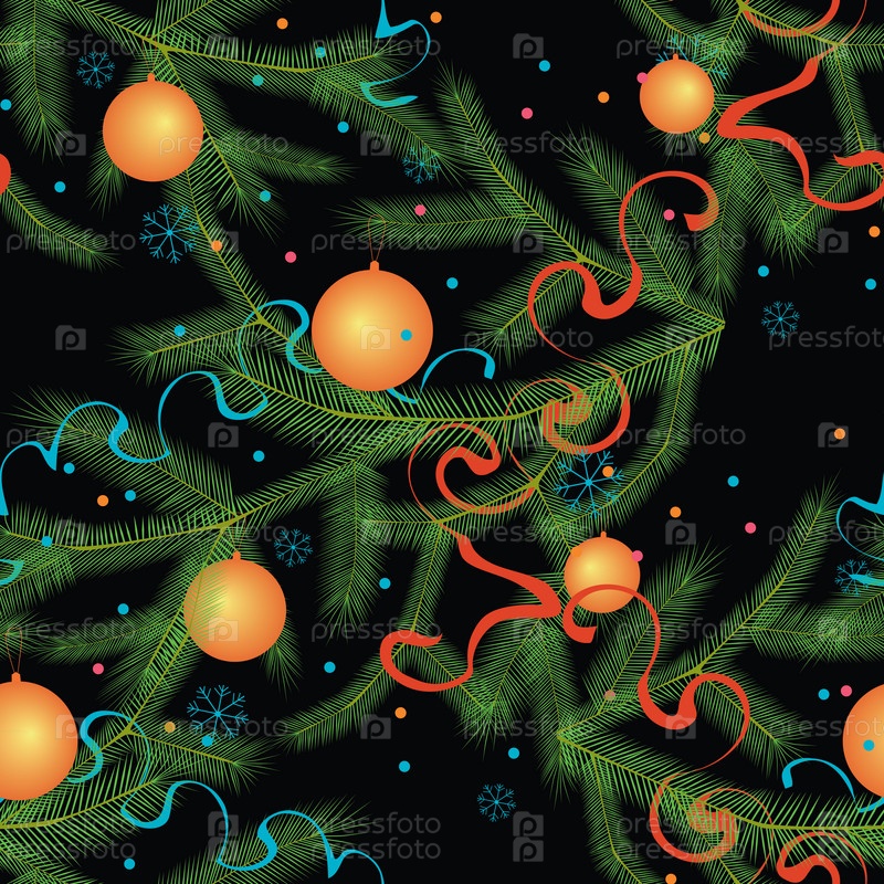 Бесшовный узор из ветвей елки с праздничными шарами и лентами