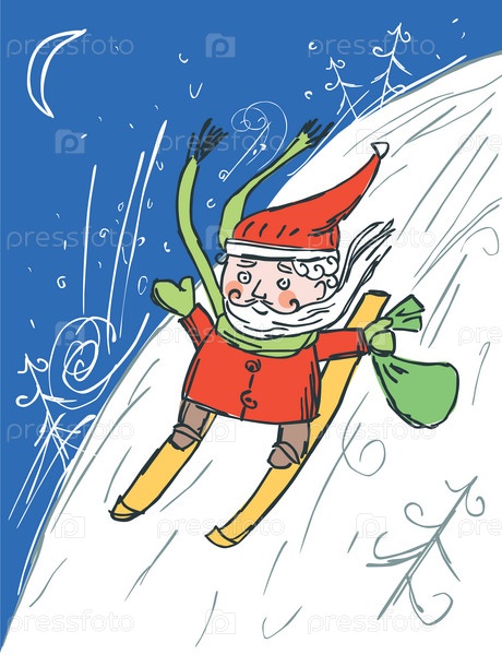 Рождественская открытка с мультяшным Санта-Клаусом с сумкой подарков, катающимся на лыжах с горы на высокой скорости