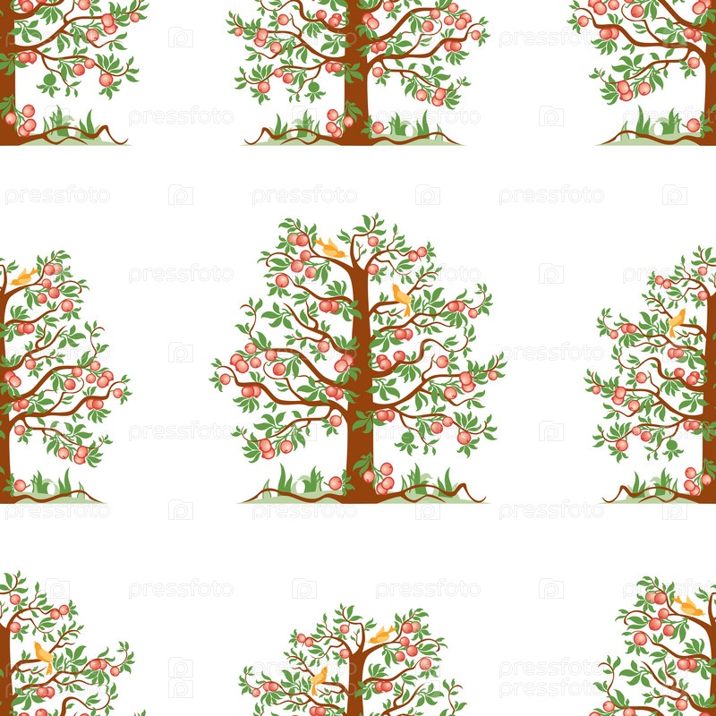 Бесшовный рисунок яблонь со спелыми яблоками