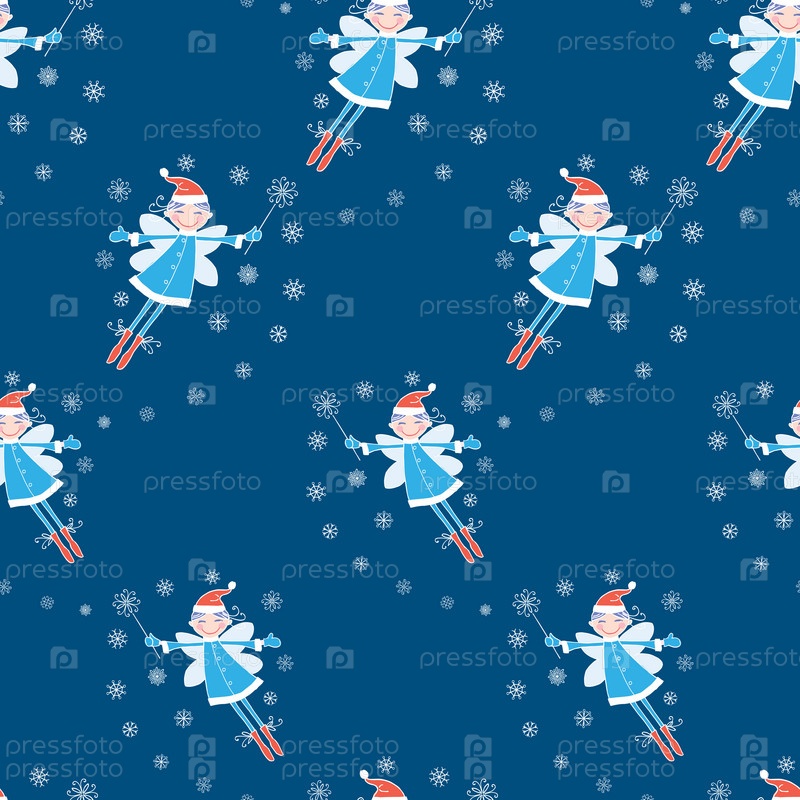 Бесшовный рисунок веселой летающей зимней эльфийки с волшебной палочкой