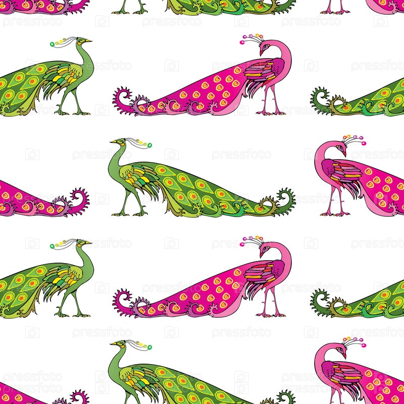Бесшовный узор из декоративных зеленых и розовых павлинов