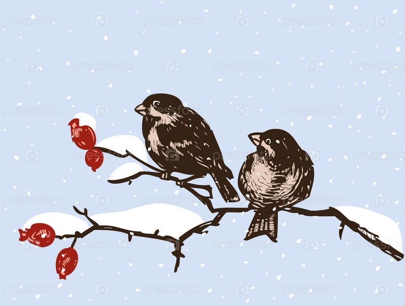 Воробьи сидят на ветвях в зимний день