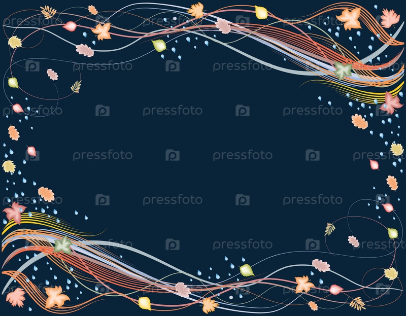 Векторная карта с декоративной рамкой из осенних листьев, капель дождя, завитков и линий