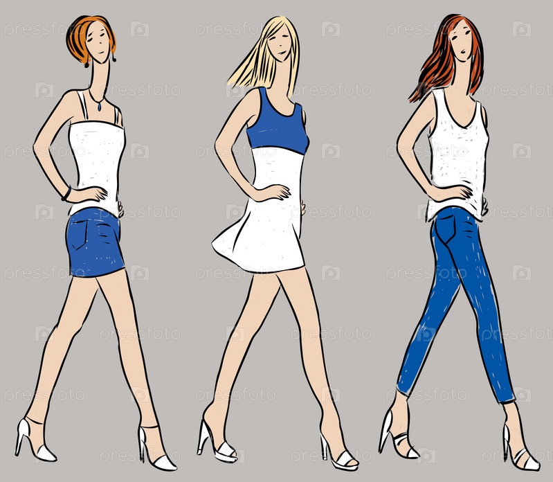 Векторный рисунок шагающих стройных женщин в джинсовой летней одежде