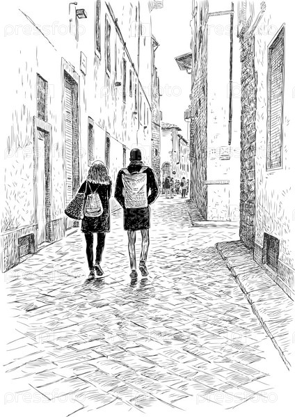 Пара горожан гуляет по старому городу
