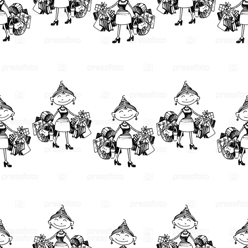 Бесшовный фон веселой смешной женщины с покупками