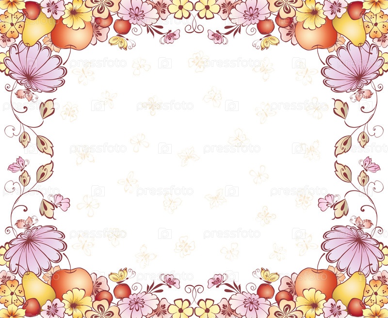 Векторная открытка с цветочной рамкой из фруктов, цветов и бабочек