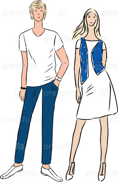 Векторная иллюстрация пары молодых людей в летней хлопчатобумажной джинсовой одежде
