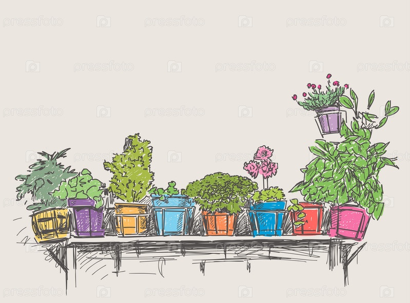 Векторное изображение эскизов цветочных горшков с комнатными растениями подряд на полке
