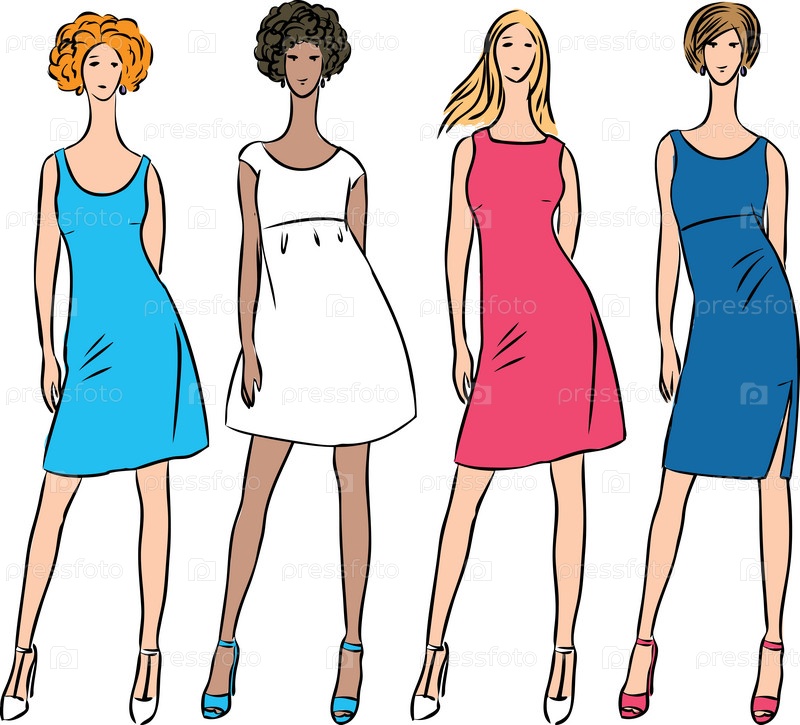 Векторное изображение эскизов модных стройных женщин в различных летних платьях