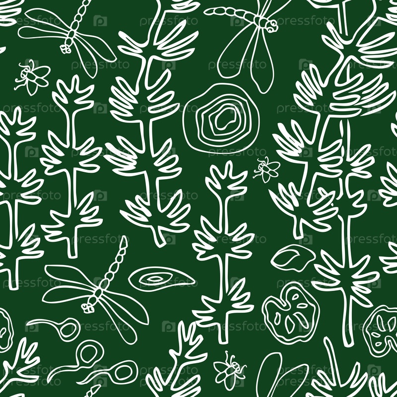 Векторный бесшовный рисунок очертаний водных растений и насекомых