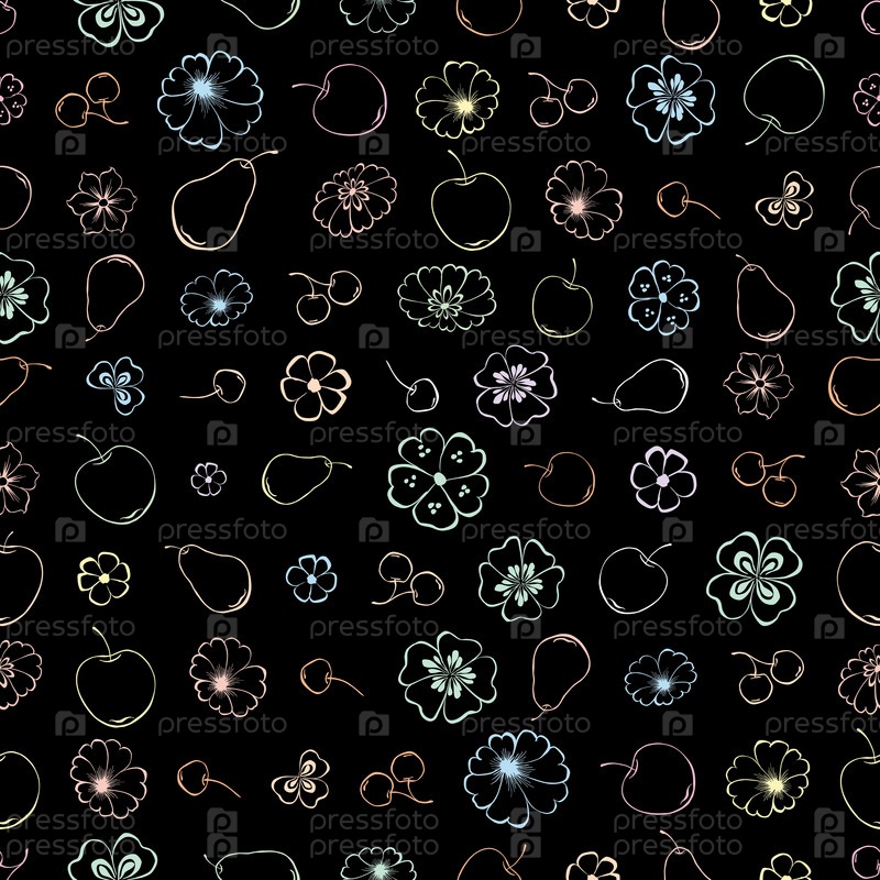 Бесшовный рисунок очертаний различных фруктов и цветов