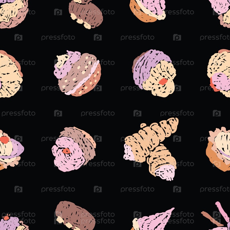 Бесшовный узор из набора нарисованных вкусных пирожных