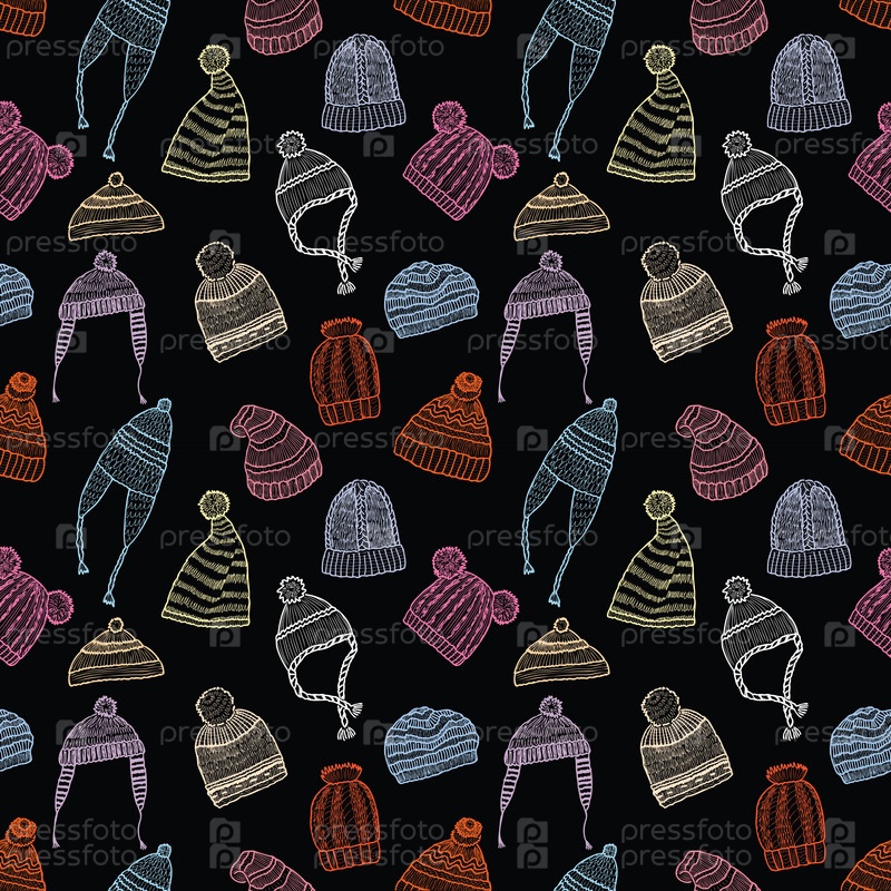 Бесшовный рисунок различных вязаных шапок на зиму