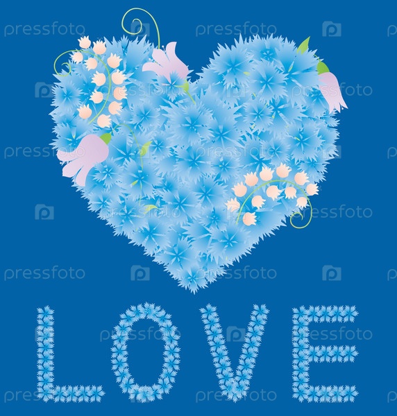 Векторная открытка с цветочным сердцем из белых и розовых роз и надписью "любовь"