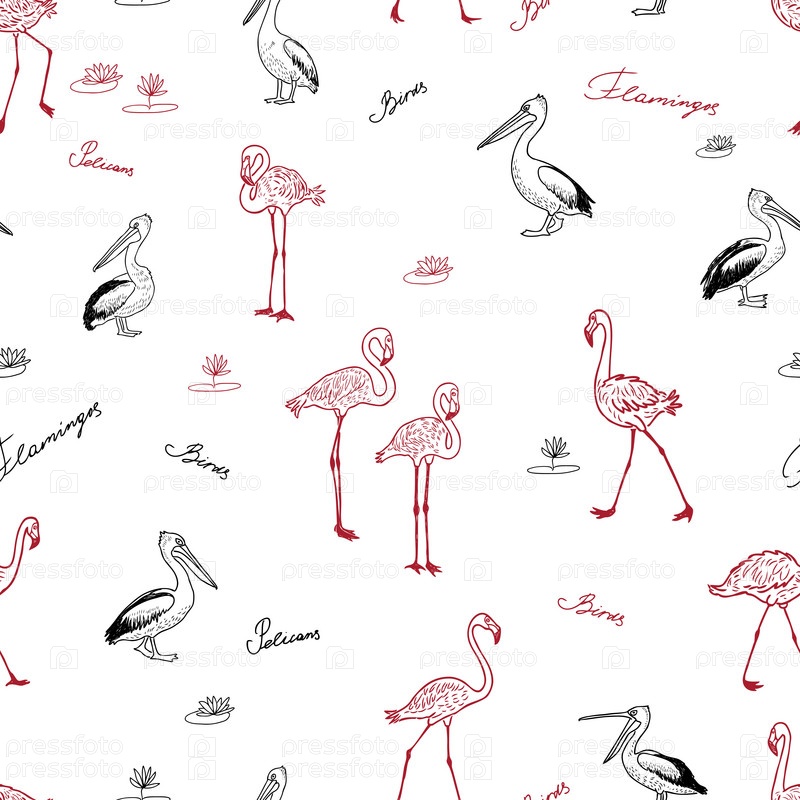 Бесшовный фон из нарисованных фламинго и пеликанов