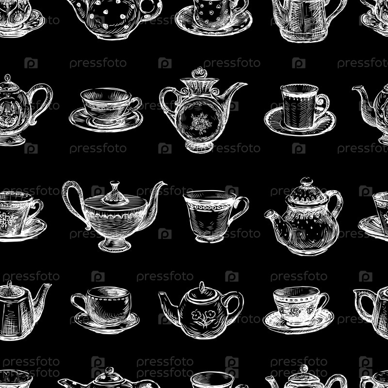 Бесшовный фон из нарисованных чашек и чайников