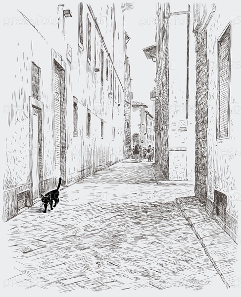 Черная кошка гуляет по старому городу