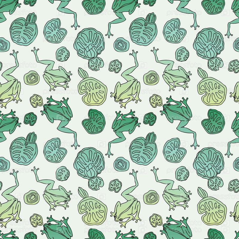 Бесшовный фон из лягушек и листьев в лесном озере