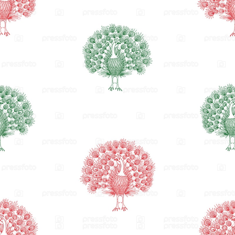 Бесшовный фон из нарисованных красных и зеленых декоративных павлинов