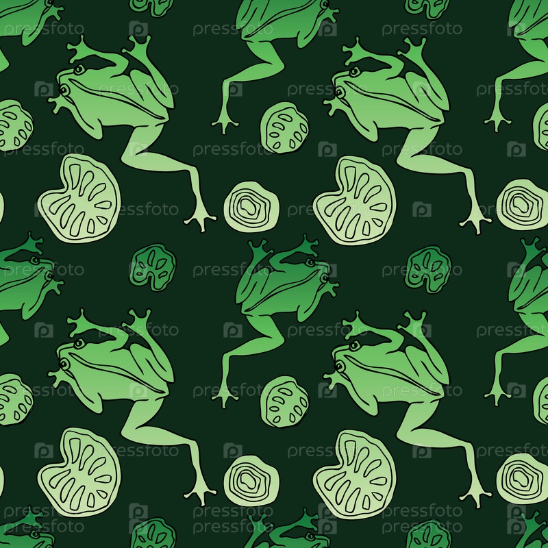 Бесшовный рисунок нарисованных зеленых лягушек и листьев