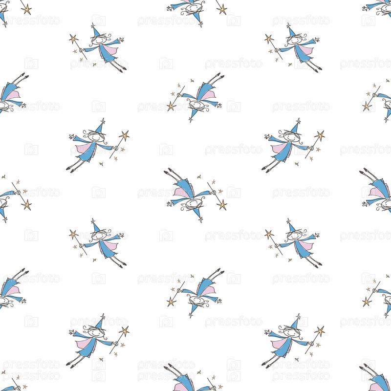 Бесшовный рисунок эскизов летающих забавных волшебниц с волшебными палочками