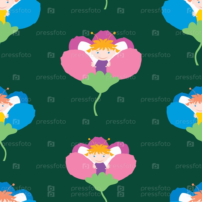 Бесшовный фон с мальчиками-эльфами, сидящими в цветах