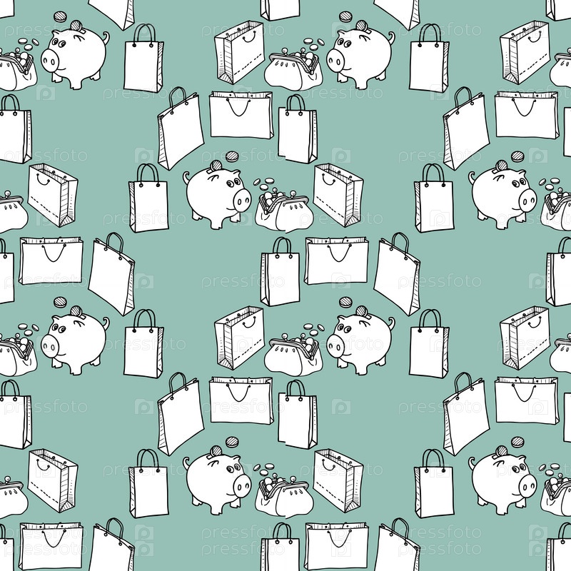 Бесшовный рисунок копилки, кошелька и сумок для покупок
