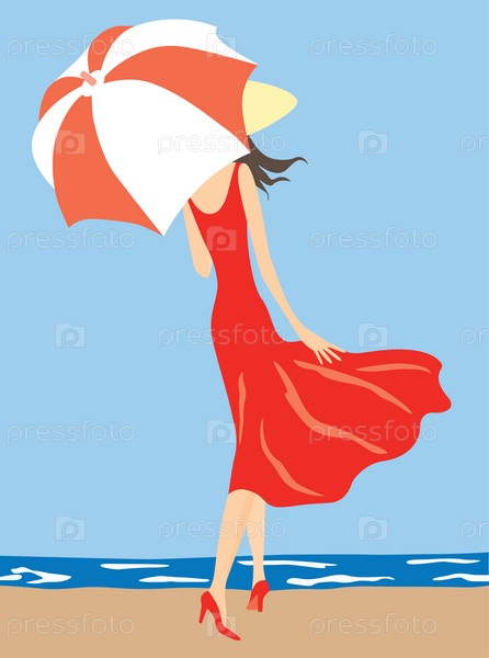 Векторная иллюстрация молодой стройной женщины, идущей под зонтиком на берегу моря