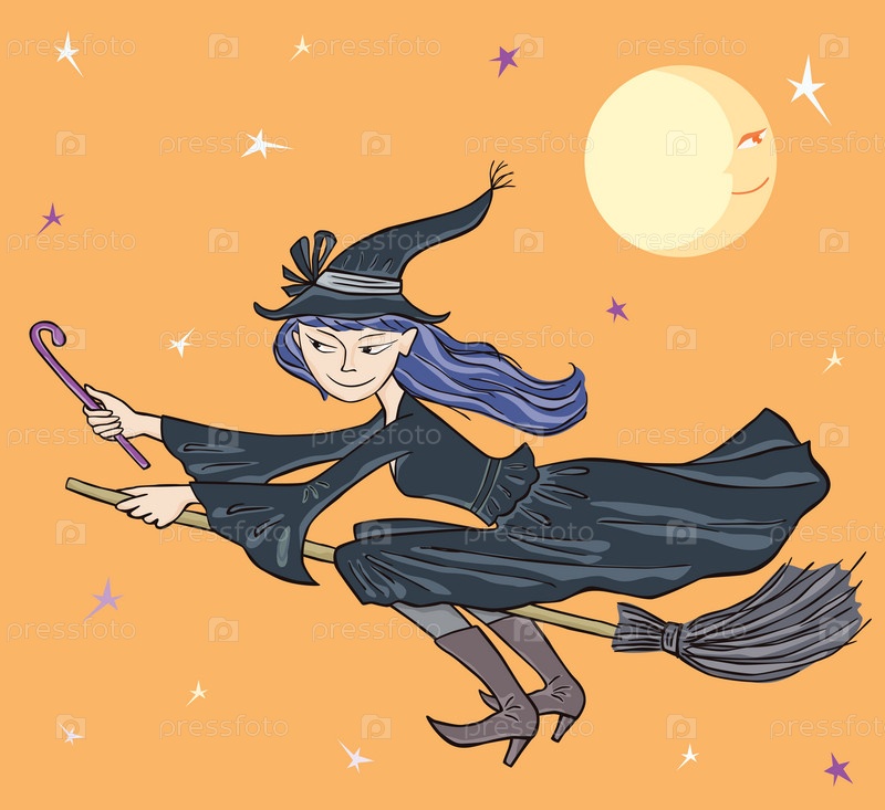 Векторная иллюстрация молодой ведьмы, летящей на метле в ночь Хэллоуина