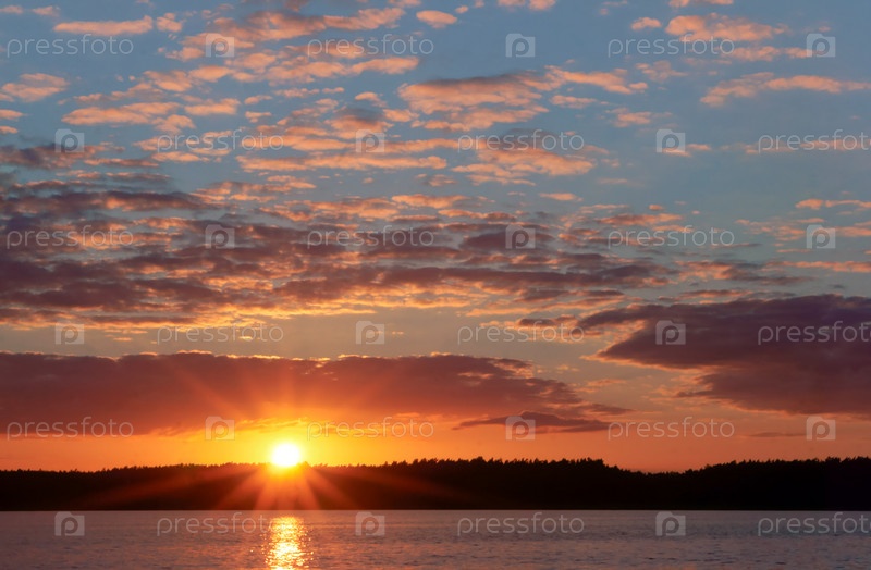 Солнце пробивается сквозь деревья, закат, солнце отражается в воде