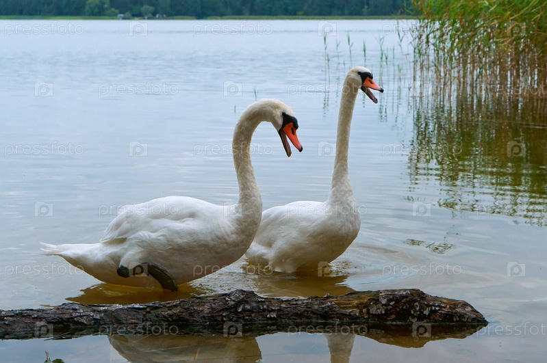 Лебеди вышли на берег, лебеди на озере, водоплавающие птицы в естественных условиях