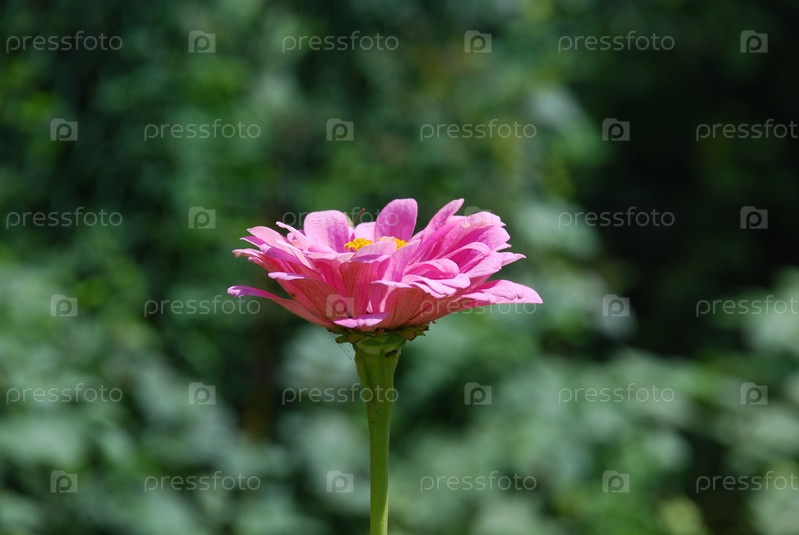 Большой розовый цветок циннии. На фоне зеленых растений и других цветов цветок цинния распускается на длинном тонком стебле. У него светло-розовые лепестки и желтая серединка