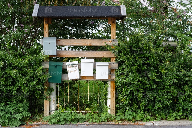Почтовые ящики на деревянной подставке