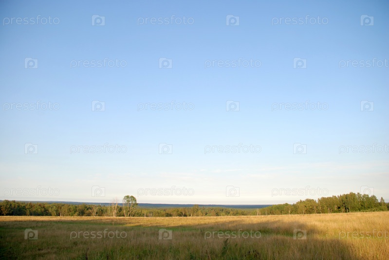 Поле с пожелтевшей травой. В ясный солнечный день поле с желтой выжженной травой частично освещено солнцем, частично в тени, небо чистое, светло-голубое с редкими облаками