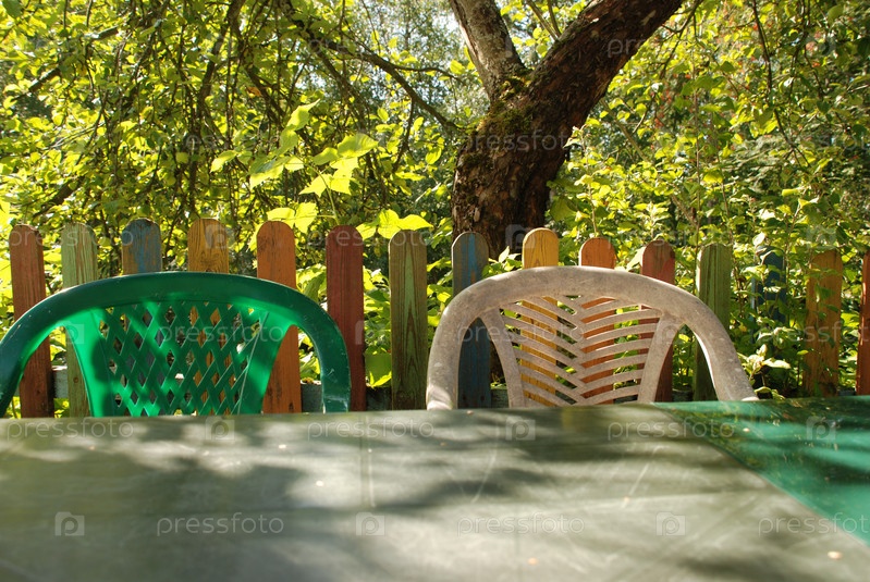 Садовые стулья у зеленого стола