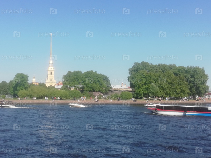 Петропавловская крепость и Петропавловский собор на Заячьем острову летним днем. Мимо плывут прогулочные катера и кораблики, прогуливаются туристы и жители города