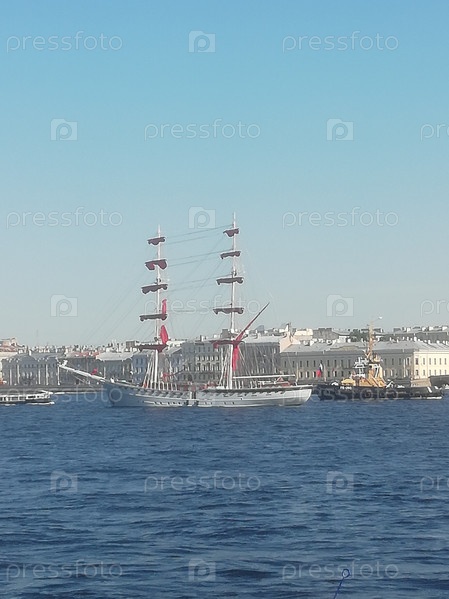Бриг Россия со свернутыми парусами алого цвета в ожидании репетиции праздника для выпускников Алые паруса в Санкт-Петербурге в июне 2023