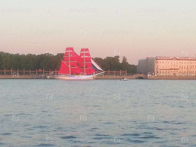 Бриг Россия с развернутыми парусами алого цвета на репетиции праздника для выпускников Алые паруса в Санкт-Петербурге в июне 2023
