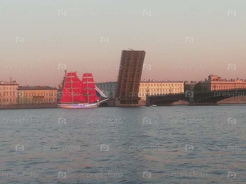 Бриг Россия с развернутыми парусами алого цвета на фоне разведенного Троицкого моста на репетиции праздника для выпускников Алые паруса в Санкт-Петербурге в июне 2023