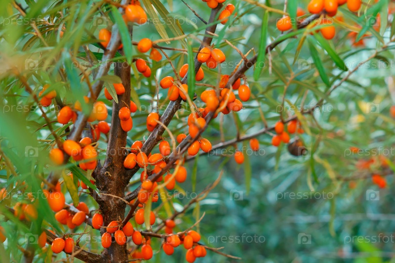 Оранжевые ягоды облепихи на кустах, облепиха