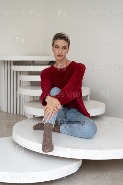 Молодая красивая женщина позирует в красном свитере в студии, сидит