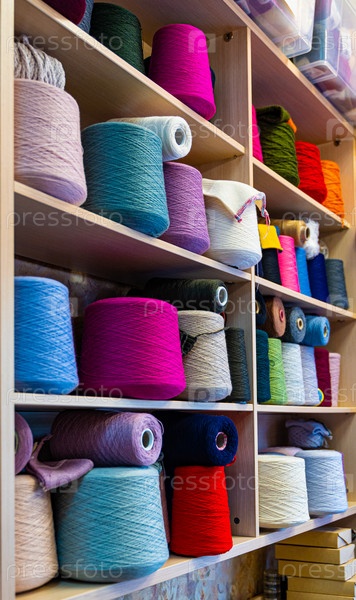 Полки с бобина разноцветных ниток шерсти в магазине