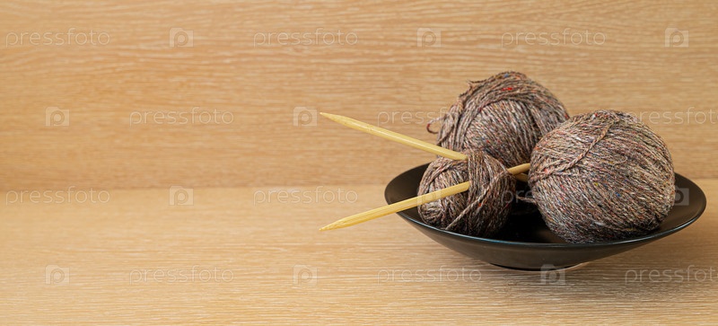 Три мотка из коричневой деревенской пряжи с деревянными спицами в черной тарелке на деревянной поверхности